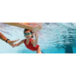 Usa el clip infantil para ajustar fácilmente la correa alrededor de la cabeza y asegurarla. La junta suave y la correa de silicona se adaptan cómodamente a la cara del niño, lo que facilita la transición al agua.
